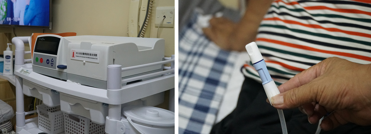 Tsui-han is a 76 year-old woman who was diagnosed with kidney disease four years ago. Since last year, she has been undergoing peritoneal dialysis at home every day. Due to her frailty and inability to walk, her son helps her with the treatment every day after work. 'The treatment produces a lot of waste!' said his son, Mr. Ng.