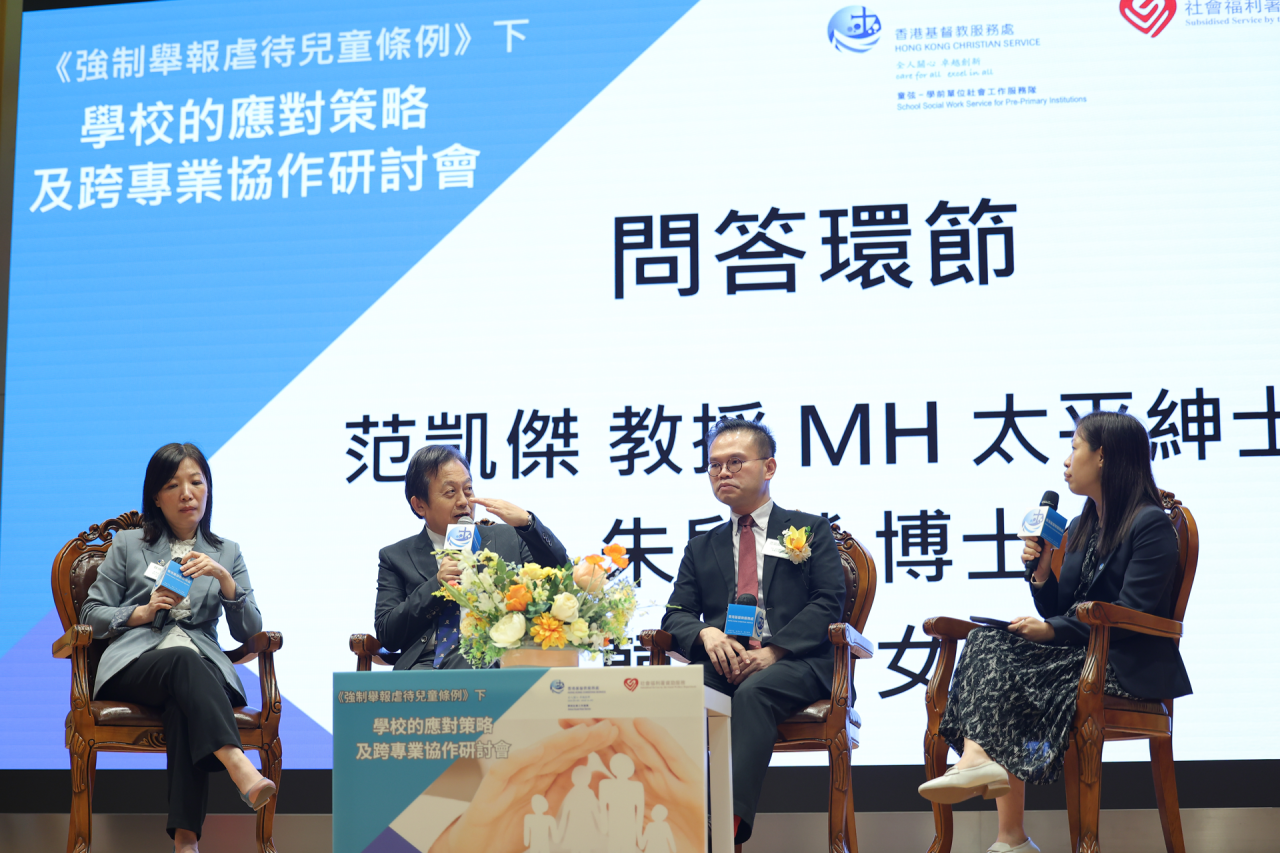 研討會特邀范凱傑教授, MH, 太平紳士、執業大律師及中華基督教會香港區會學務總監朱啟榮博士,以及本處學校社會工作服務服務總監韓順心女士,分享如何從法律角度解讀條例、學校對條例即將生效的準備及實務協作等重要議題。參加者反映研討會內容實用,有助他們作好準備。
