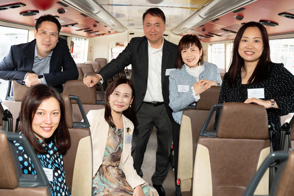 主禮嘉賓運輸署助理署長黃志光太平紳士(中),與本處總幹事翟冬青女士(右二)、總運輸主任莫家聲先生(左上)、本處副總幹事梁李紫薇女士(前排左二)、本處兒童復康服務服務總監陳嘉霖博士(前排最左)及九巴顧客體驗部主管吳家敏女士(右)在主題巴士上合照。